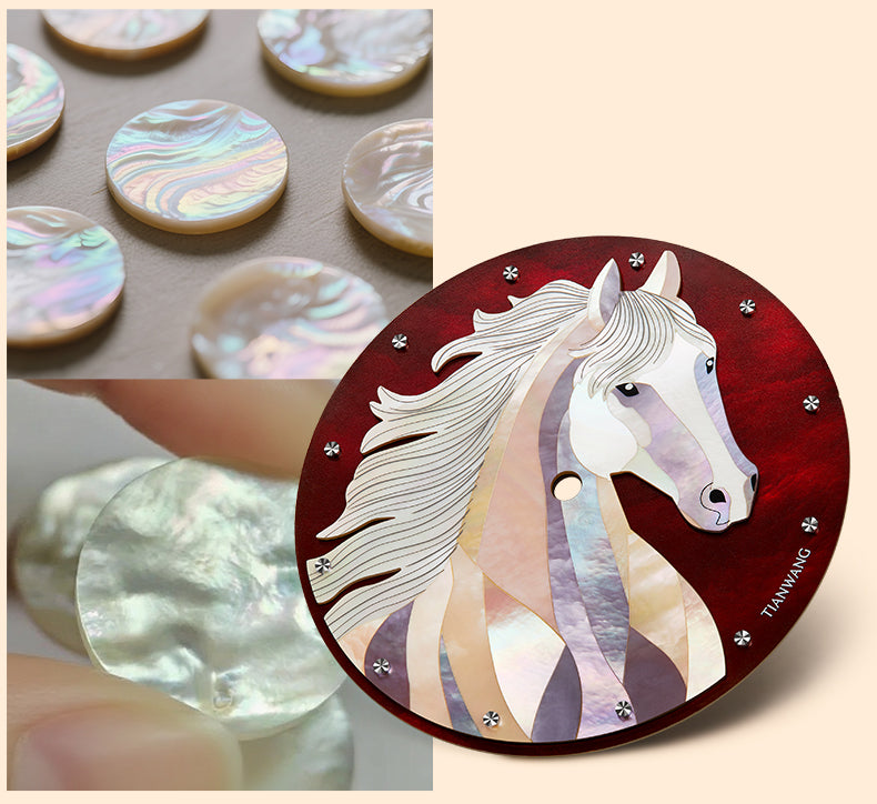 The centerpiece is a breathtaking dial, meticulously handcrafted using natural mother-of-pearl. The intricate inlay technique creates a shimmering, multi-dimensional depiction of the majestic horse, ensuring that no two watches are exactly alike.